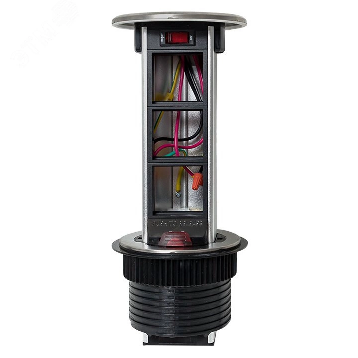 Встраиваемая мини-колонна, 6 модулей C-Line. Встраиваемая мини-колонна – это изделие цилиндрической формы с ручным выдвижным механизмом, предназначенное для установки ЭУИ стандарта 45х45. Изделие поставляется в комплекте с сетевым кабелем питания (2 метра). В нижней крышке колонны предусмотрены 2 дополнительных кабельных ввода. Монтаж производится в предварительно подготовленное отверстие диаметром ?95-100 мм. Допустимая толщина поверхности стола 10-45 мм.