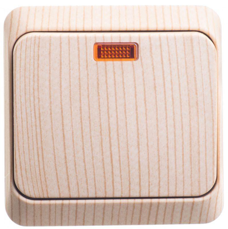 Выключатель Schneider Electric ЭТЮД (сосна, открытой установки) одноклавишный предназначен для применения в сетях до 250В, на ток до 10А. Наличие подсветки делает его легко находимым при отсутствии освещения. Выключатель подходит для большинства типов ламп, включая люминесцентные. Изделия цвета Сосна обладают уникальным рисунком, напоминающим древесный сруб. Сделано в России.
