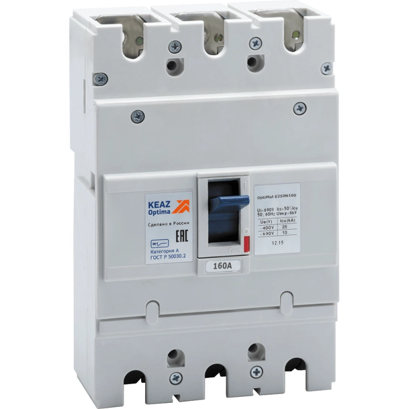 Блочный автоматический 3 полюсный выключатель переменного тока с предельной коммутационной способностью при переменном токе 25 кА на номинальный ток 160 А.