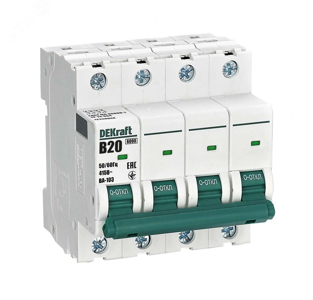 Автоматический выключатель серии ВА-103 NEW DEKraft - 4P, номинальный ток 20 А - характеристика B - отключающая способность 6 кА, что позволяет использовать аппараты в качестве вводных. 5 монолитных заклепок повышают прочность корпуса аппарата. Окошко-индикатор всегда показывает состояние контактов вне зависимости от положения рукоятки управления. Боковые каналы охлаждения повышают стабильность работы при высоких температурах окружающей среды. Есть возможность установки дополнительных аксессуаров с левой стороны устройства. Аппарат на 100% совместим с корпусами и оболочками DEKraft, Systeme Electric.