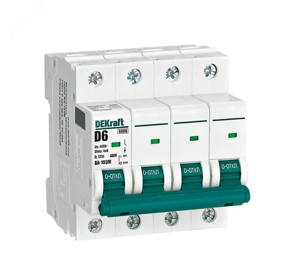 Автоматический выключатель без теплозащиты серии ВА-103M DEKraft, 4P, ном. ток 6 А, ном. раб. напряжение 400 В, кривая отключения D. Автоматические выключатели серии ВА-103М имеют специальное назначение для систем противопожарной защиты и вентиляции и выдерживают ток КЗ до 6000 А. Также они могут использоваться для нечастых оперативных включений и отключений указанных цепей. Автоматические выключатели соответствуют директиве RoHS, имеют расширина енный диапазон рабочих температур от -25 до +60 градусов по Цельсию, удобны и безопасны в эксплуатации.