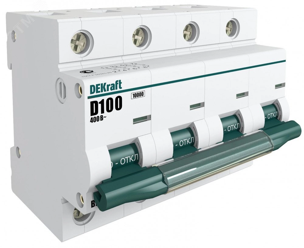Автоматический выключатель серии ВА-201 DEKraft, 4P, номинальный ток 100 А, характеристика D, отключающая способность 10 кА, ширина - 6 мод. х 18мм. Монолитная лицевая панель обеспечивает безопасную эксплуатацию аппарата. Окошко-индикатор всегда показывает состояние аппарата вне зависимости от положения рукоятки управления. Двухпозиционная защелка облегчает монтаж выключателя. Клеммы рассчитаны на подключение проводников сечением до 35 кв.мм.
