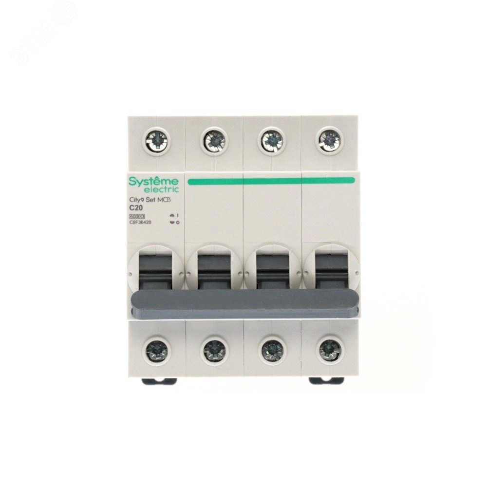 Автоматический выключатель серии City9 Set Systeme Electric, 4-полюсный, номинальный ток 20 А, характеристика С, Icn - 6 кА. Применяется в электрических сетях напряжением 400 В. Предназначен для защиты от перегрузок и токов короткого замыкания. Оснащен механизмом «мгновенной коммутации». Ударопрочный корпус из специального пластика с 6 металлическими заклепками. Безопасные клеммы исключают попадание кабелей в заклеммное пространство.
