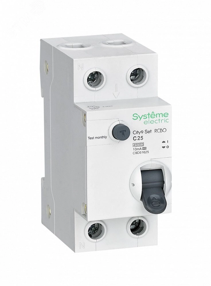 Автоматические выключатели дифференциального тока (АВДТ) серии City9 Set Systeme Electric,1P+N, номинальный ток 25 А, характеристика С, Icn 4.5 кА, ток утечки 10 мА, тип А. АВДТ применяется в электрических сетях напряжением 230В. Предназначен для защиты сети от перегрузок, людей от поражения электрическим током и токов короткого замыкания. Уставка по току утечки 10 мА обеспечивает гарантированную защиту людей при прямом прикосновении. Кнопка тест обеспечивает проверку работоспособности аппарата. Крепление на DIN-рейку шириной 35 мм. Безопасные клеммы.