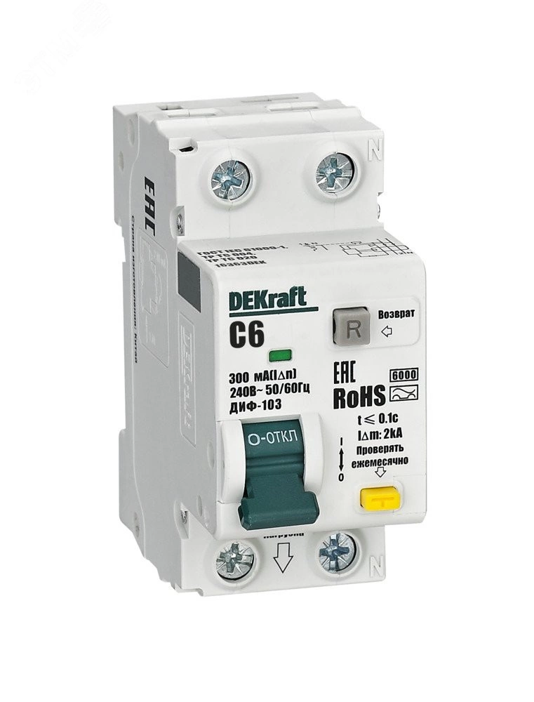 Автоматические выключатели дифференциального тока серии ДИФ-103 6кА NEW Dekraft, 1P+N, номинальный ток 6 А, ном. диф. ток 300 мА, тип диф. расцепителя - A, кривая отключения - С, Icn, Ics 6 кА, тип устройства - электронный, монтаж – на DIN-рейку. АВДТ обеспечивают три вида защиты — от короткого замыкания, перегрузки и возникновения утечки тока (в частности, вследствие прикосновения человека к токоведущим частям). АВДТ с отключающей способностью 6кА применяются во вводно-распределительных устройствах (ВРУ), главных распределительных щитах (ГРЩ), осветительных и распределительных установках в общественных, административных, производственных, промышленных и других подобных зданиях.