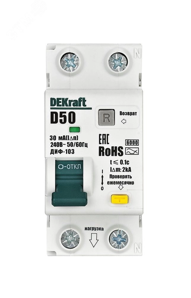 Автоматические выключатели дифференциального тока серии ДИФ-103 6кА NEW Dekraft, 1P+N, номинальный ток 50 А, ном. диф. ток 30 мА, тип диф. расцепителя - AC, кривая отключения - D, Icn, Ics 6 кА, тип устройства - электронный, монтаж – на DIN-рейку. АВДТ обеспечивают три вида защиты — от короткого замыкания, перегрузки и возникновения утечки тока (в частности, вследствие прикосновения человека к токоведущим частям). АВДТ с отключающей способностью 6кА применяются во вводно-распределительных устройствах (ВРУ), главных распределительных щитах (ГРЩ), осветительных и распределительных установках в общественных, административных, производственных, промышленных и других подобных зданиях.