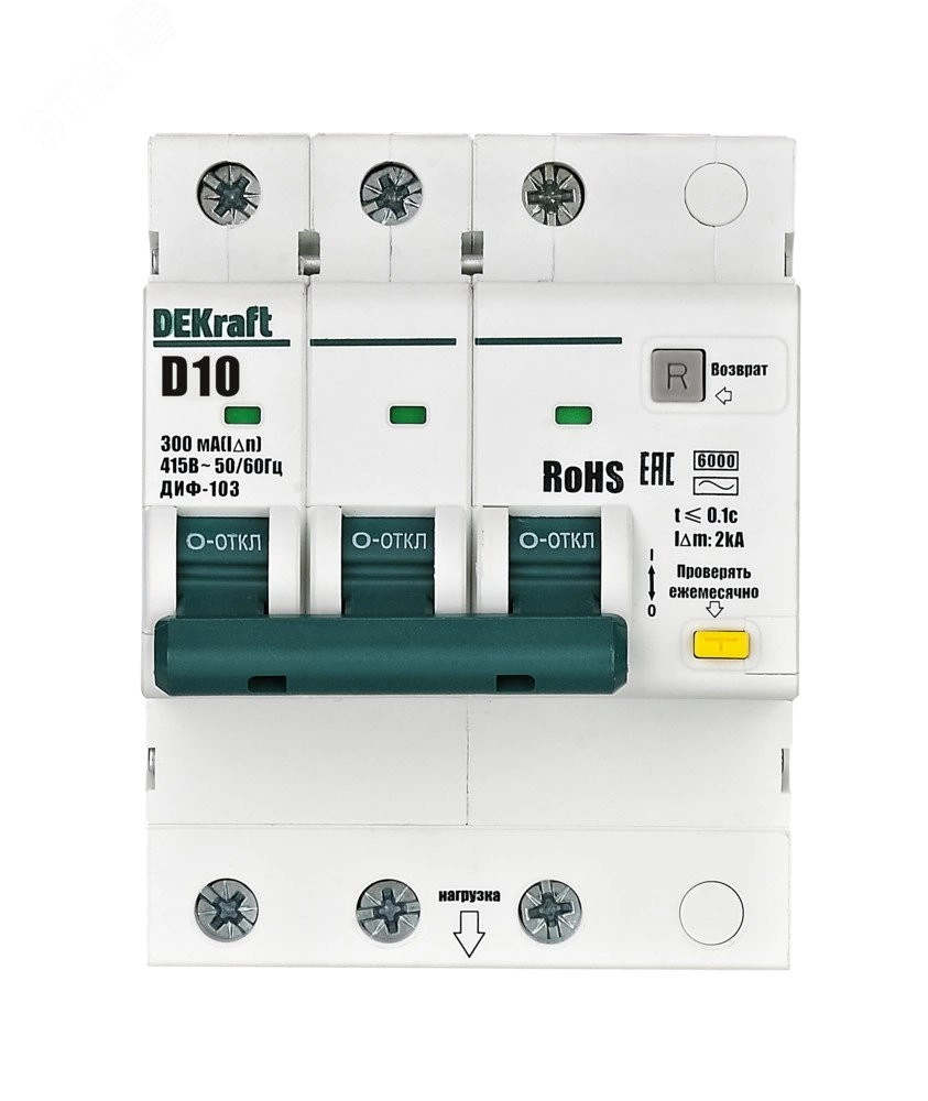 Автоматические выключатели дифференциального тока серии ДИФ-103 6кА NEW Dekraft, 3P, номинальный ток 10 А, ном. диф. ток 300 мА, тип диф. расцепителя - AC, кривая отключения - D, Icn, Ics 6 кА, тип устройства - электронный, монтаж – на DIN-рейку. АВДТ обеспечивают три вида защиты — от короткого замыкания, перегрузки и возникновения утечки тока (в частности, вследствие прикосновения человека к токоведущим частям). АВДТ с отключающей способностью 6кА применяются во вводно-распределительных устройствах (ВРУ), главных распределительных щитах (ГРЩ), осветительных и распределительных установках в общественных, административных, производственных, промышленных и других подобных зданиях.