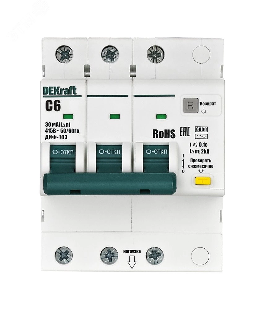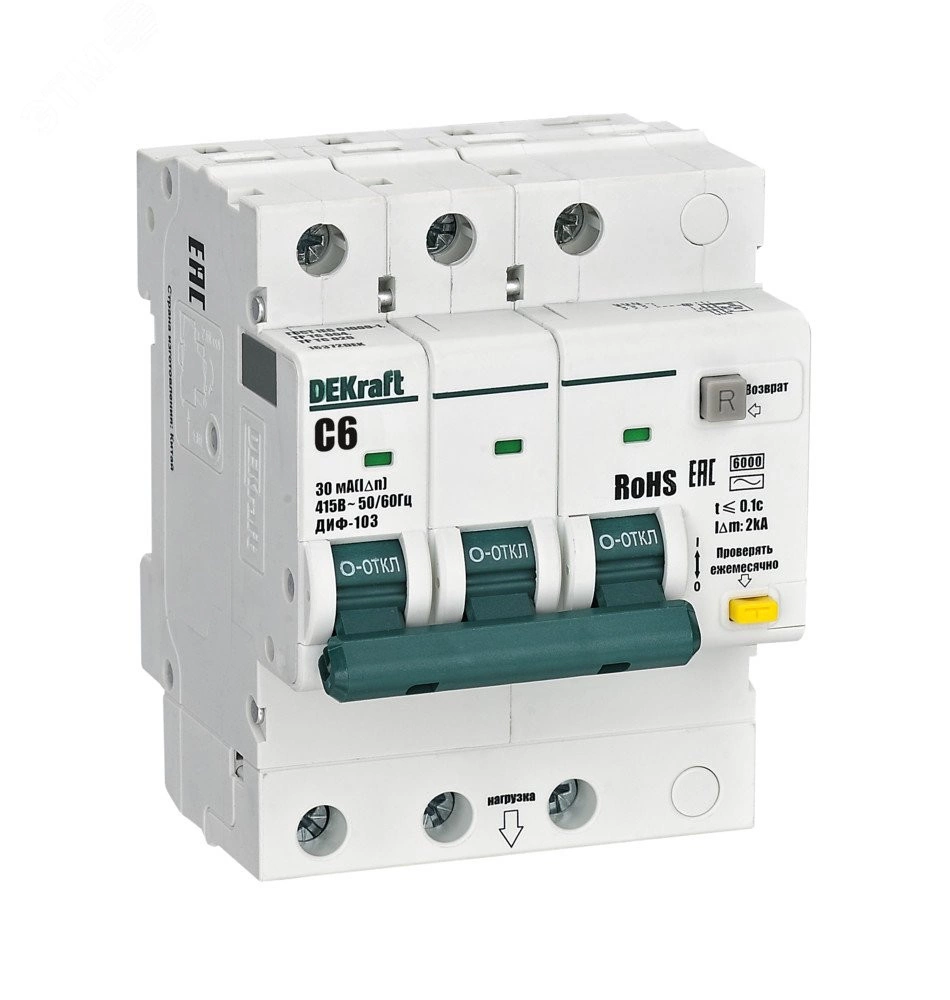 Автоматические выключатели дифференциального тока серии ДИФ-103 6кА NEW Dekraft, 3P, номинальный ток 6 А, ном. диф. ток 30 мА, тип диф. расцепителя - AC, кривая отключения - С, Icn, Ics 6 кА, тип устройства - электронный, монтаж – на DIN-рейку. АВДТ обеспечивают три вида защиты — от короткого замыкания, перегрузки и возникновения утечки тока (в частности, вследствие прикосновения человека к токоведущим частям). АВДТ с отключающей способностью 6кА применяются во вводно-распределительных устройствах (ВРУ), главных распределительных щитах (ГРЩ), осветительных и распределительных установках в общественных, административных, производственных, промышленных и других подобных зданиях.
