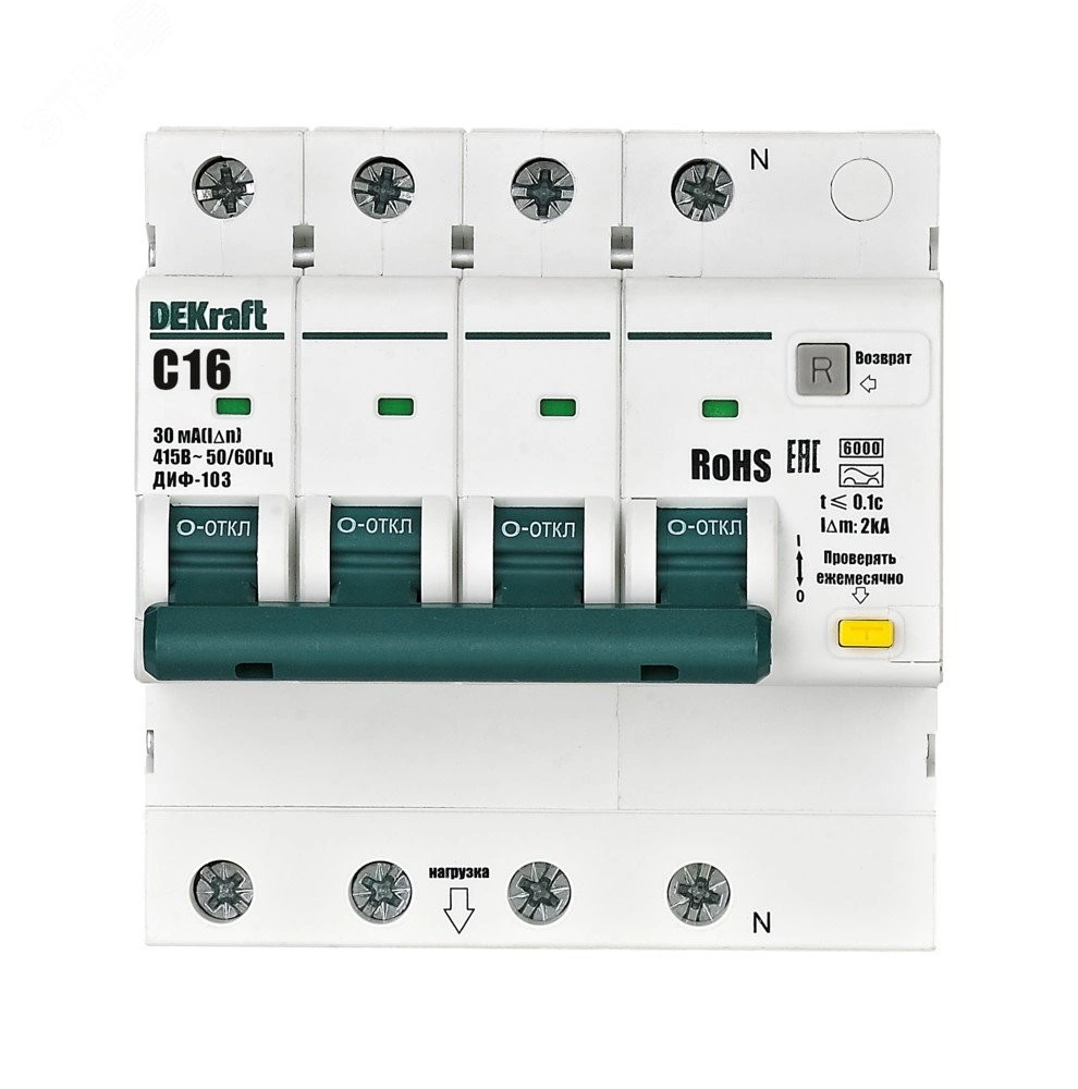 Автоматические выключатели дифференциального тока серии ДИФ-103 6кА NEW Dekraft, 3P+N, номинальный ток 16 А, ном. диф. ток 30 мА, тип диф. расцепителя - A, кривая отключения - С, Icn, Ics 6 кА, тип устройства - электронный, монтаж – на DIN-рейку. АВДТ обеспечивают три вида защиты — от короткого замыкания, перегрузки и возникновения утечки тока (в частности, вследствие прикосновения человека к токоведущим частям). АВДТ с отключающей способностью 6кА применяются во вводно-распределительных устройствах (ВРУ), главных распределительных щитах (ГРЩ), осветительных и распределительных установках в общественных, административных, производственных, промышленных и других подобных зданиях.