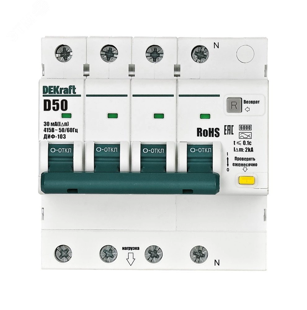 Автоматические выключатели дифференциального тока серии ДИФ-103 6кА NEW Dekraft, 3P+N, номинальный ток 50 А, ном. диф. ток 30 мА, тип диф. расцепителя - AC, кривая отключения - D, Icn, Ics 6 кА, тип устройства - электронный, монтаж – на DIN-рейку. АВДТ обеспечивают три вида защиты — от короткого замыкания, перегрузки и возникновения утечки тока (в частности, вследствие прикосновения человека к токоведущим частям). АВДТ с отключающей способностью 6кА применяются во вводно-распределительных устройствах (ВРУ), главных распределительных щитах (ГРЩ), осветительных и распределительных установках в общественных, административных, производственных, промышленных и других подобных зданиях.