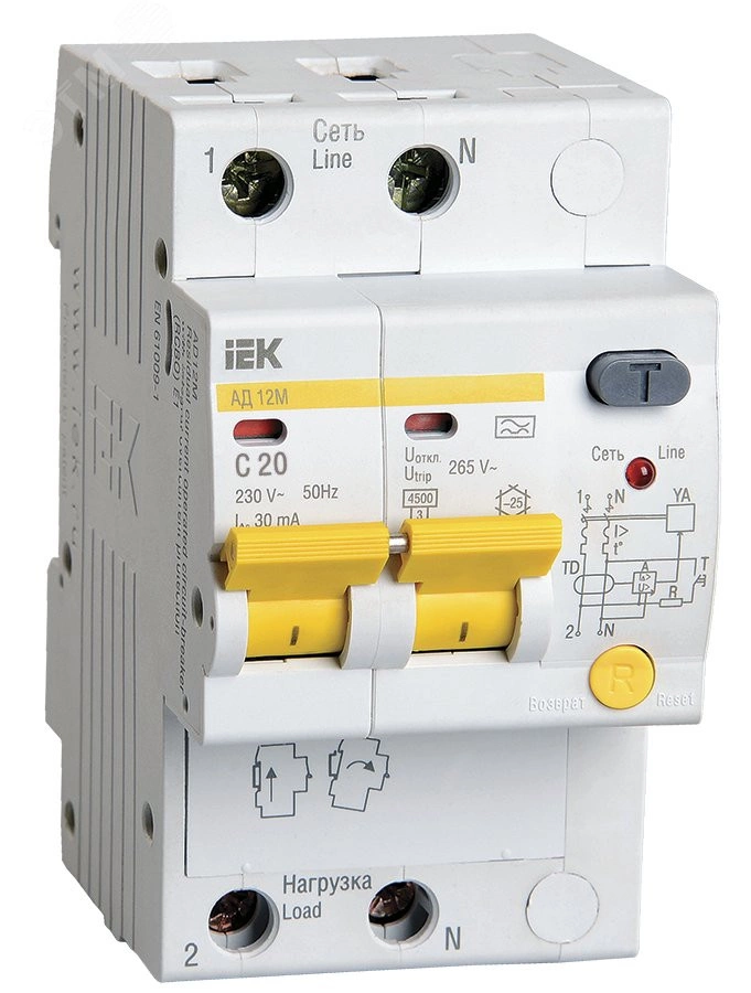Быстродействующие защитные выключатели обеспечивают защиту людей от поражения электрическим током при прямом непреднамеренном прикосновении к токоведущим частям электрооборудования, в исполнении с уставкой срабатывания 300 мА защиту от пожара из-за возгорания изоляции токоведущих частей, защиту от перегрузки и короткого замыкания, защиту от недопустимого повышения напряжения сети. В изделиях предусмотрена индикация срабатывания от дифференциального тока, а для АД12М также светодиодная индикация включенного состояния. АД12М сохраняет работоспособность при снижении напряжения электрической сети до 50 В. Преимущества: Возможность одновременного двойного присоединения шиной или гибким проводником. Выполняет функции защиты от поражения электрическим током и защиты от сверхтоков. Защита от сверхтоков в каждом полюсе. Предельная отключающая способность 4,5 кА.