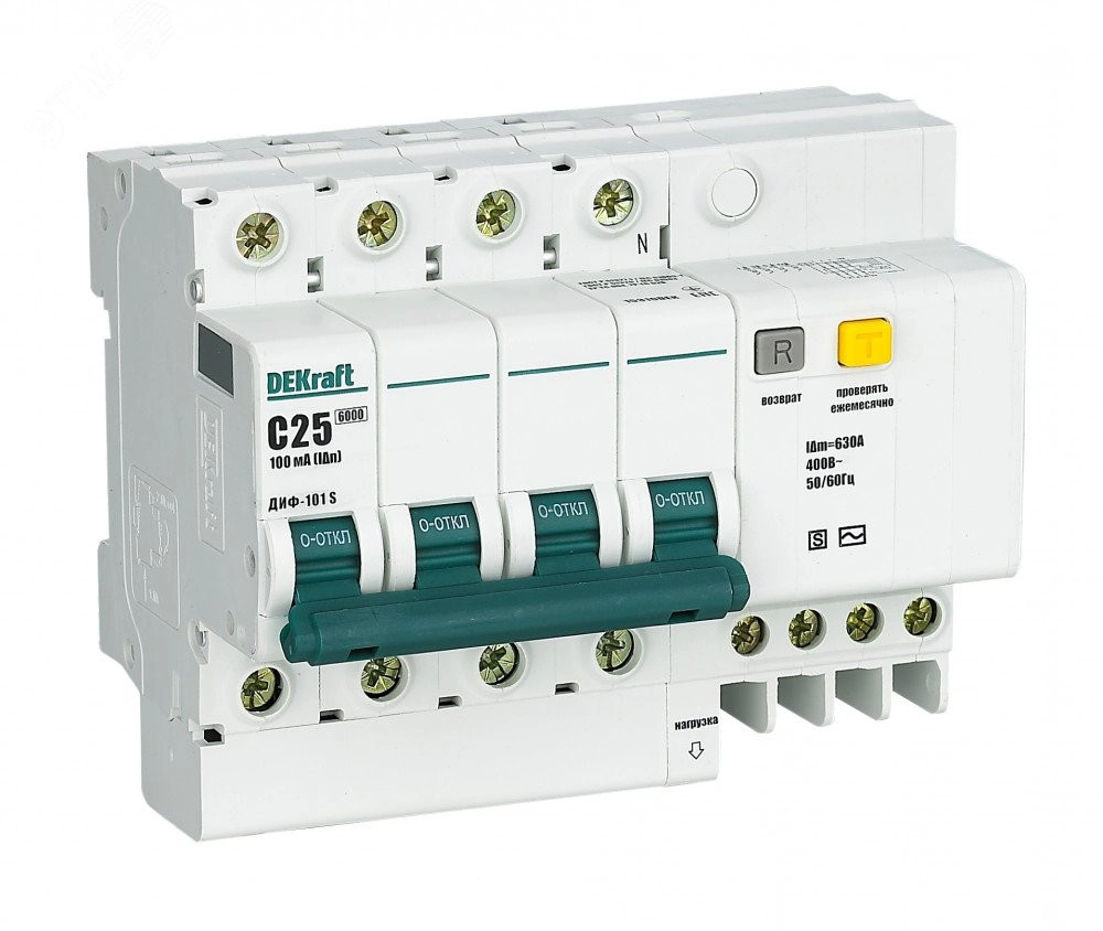 Автоматический выключатель дифференциального тока серии ДИФ-101 S DEKraft, селективный, 4P, ном.ток 25 А, характеристика C, откл.способность Icn 6 кА, ток утечки 100 мА, блок дифф.защиты - электронный, ширина - 6,5 мод. х 18 мм, монтаж - на DIN-рейку. АВДТ применяются в сетях напряжением до 400 В пер.тока для защиты электроустановок от сверхтоков и токов утечки, в щитах, где требуется ступенчатая дифференциальная защита (задержка по срабатыванию).
