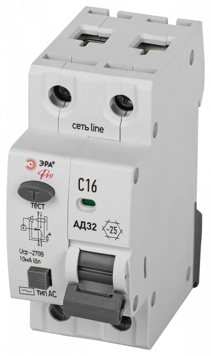 Выключатель автоматический дифференциальный электронный АВДТ 4,5кА PRO D32E2C16АC10P АД-32 1P+N C16 10мА тип АC защита 230В
