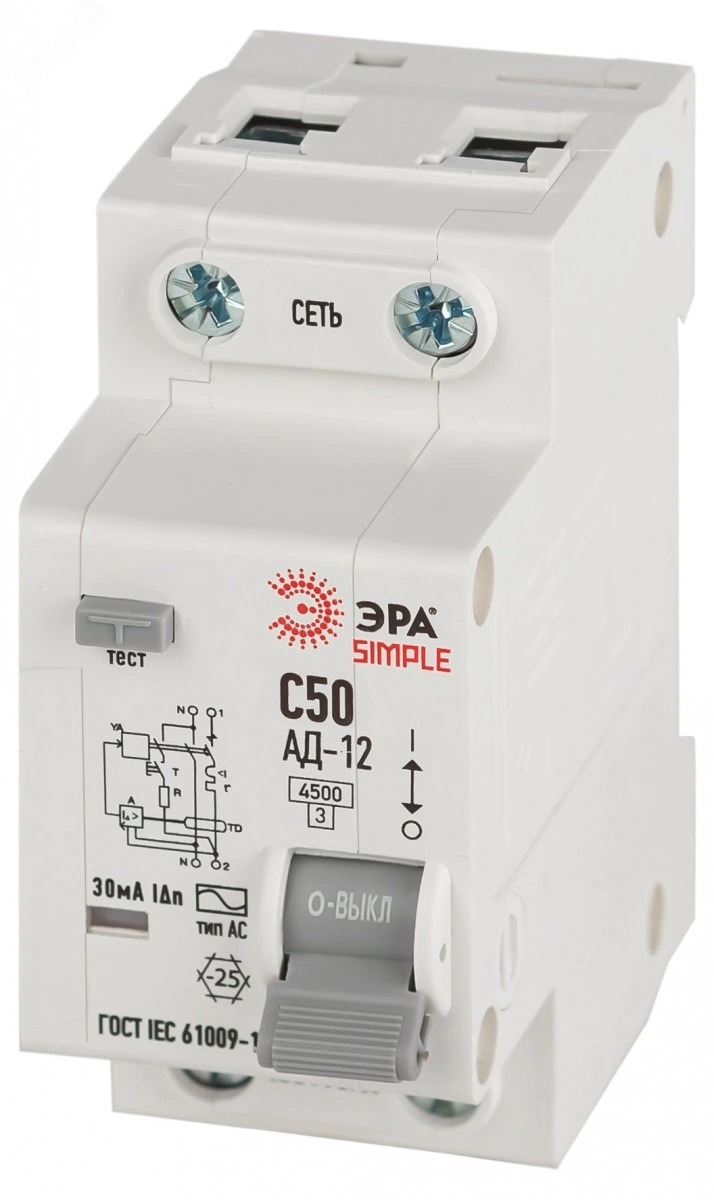 Выключатель автоматический дифференциальный электронный АВДТ 4,5кА SIMPLE D12E2C50AC30 АД-12 1P+N С50 30мА тип АС