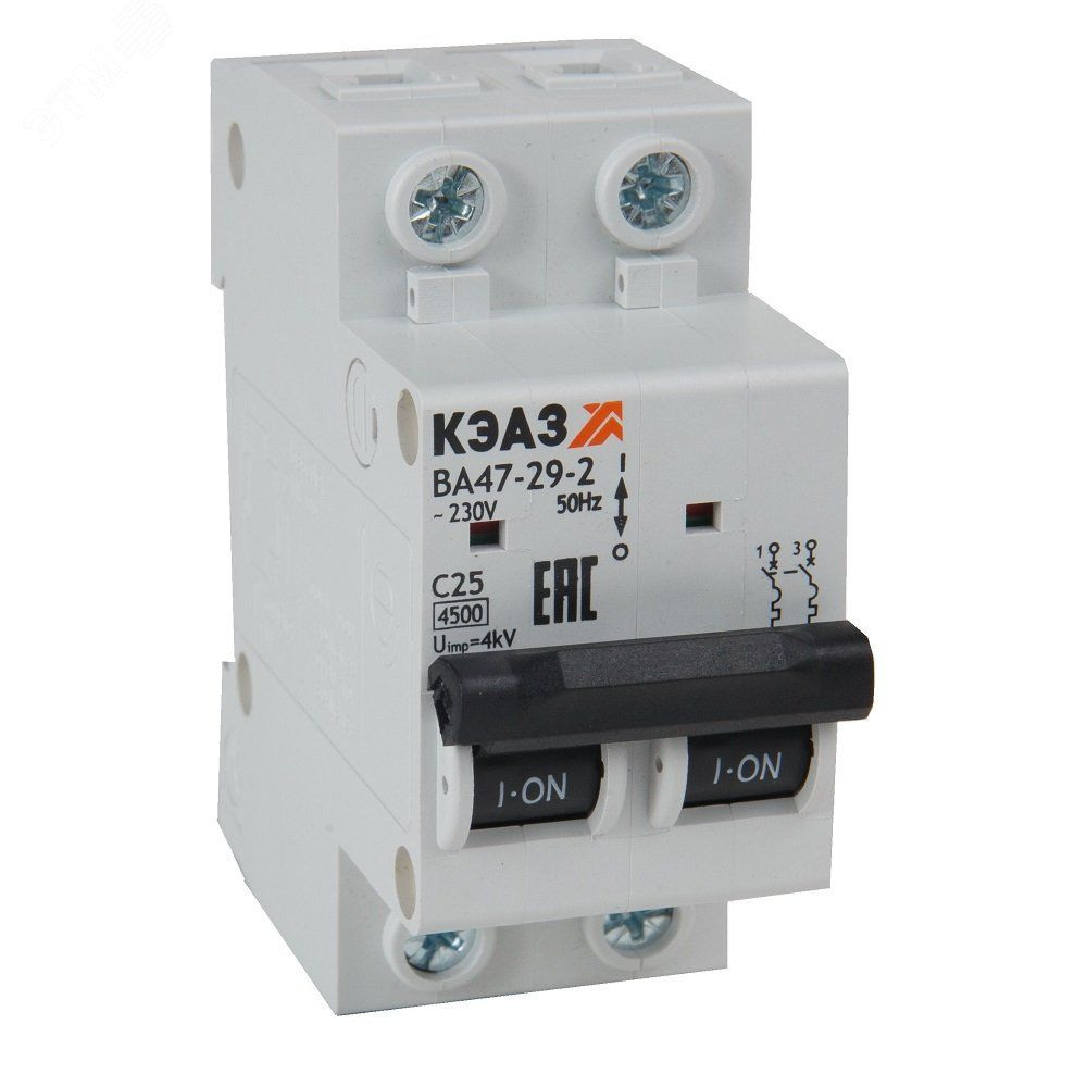 Модульный автоматический 2 полюсный выключатель переменного тока с предельной коммутационной способностью при переменном токе 4.5 кА на номинальный ток 50 А . Модульные автоматические выключатели КЭАЗ на токи до 63А защищают оборудование от токов перегрузки и короткого замыкания в системах распределения электроэнергии. Автомат ВА 47-29 специально разработан для использования в экономичных решениях с ограниченным бюджетом.