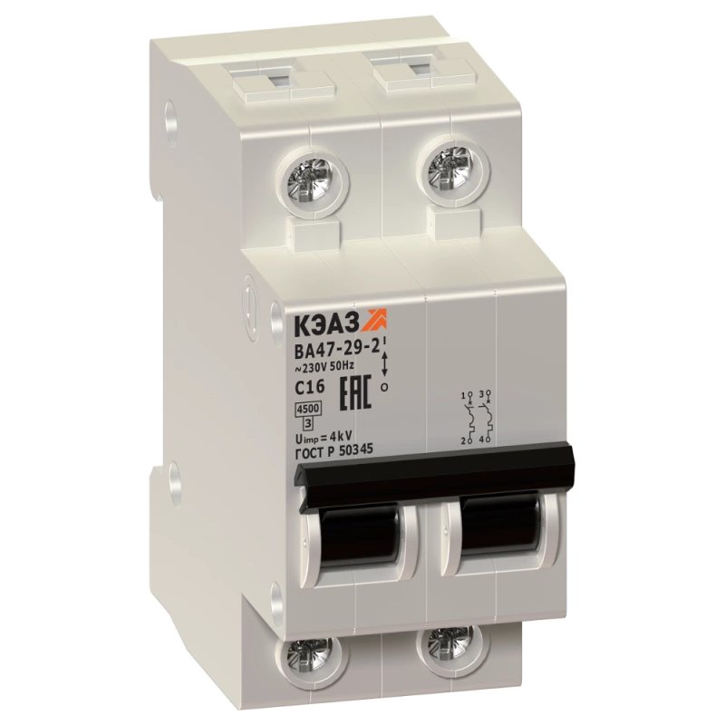 Модульный автоматический 2 полюсный выключатель переменного тока с предельной коммутационной способностью при переменном токе 4.5 кА на номинальный ток 6 А .
