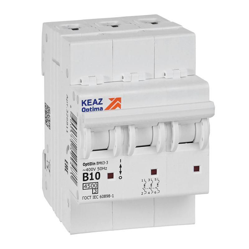Выключатель автоматический модульный 3п B 10А 10кА OptiDin BM63-3B10-4.5-УХЛ3 КЭАЗ 329518