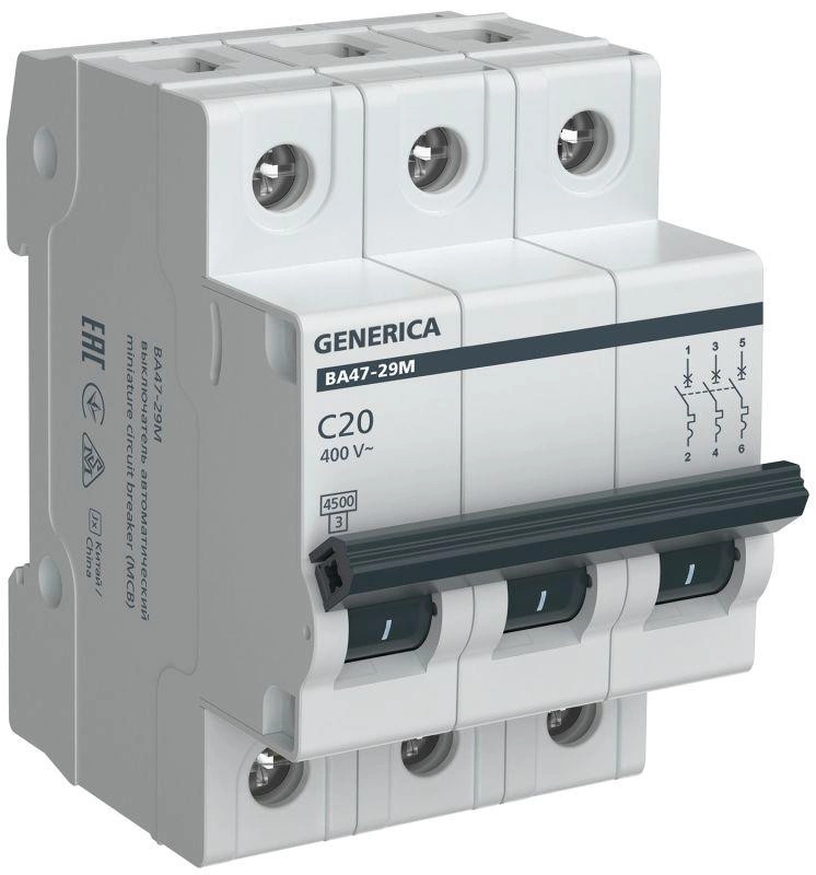 Полное описание: Выключатель автоматический модульный 3п C 20А 4.5кА ВА47-29М GENERICA MVA21-3-020-C-G