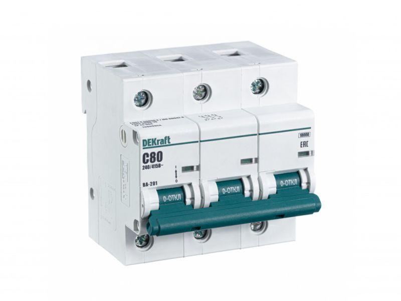 Автоматический выключатель серии ВА-201 DEKraft; 3P; номинальный ток 80 А; характеристика С; отключающая способность 10 кА; ширина – 4,5 мод. х 18мм. Монолитная лицевая панель обеспечивает безопасную эксплуатацию аппарата. Окошко-индикатор всегда показывает состояние аппарата вне зависимости от положения рукоятки управления. Двухпозиционная защелка облегчает монтаж выключателя. Клеммы рассчитаны на подключение проводников сечением до 35 кв.мм.