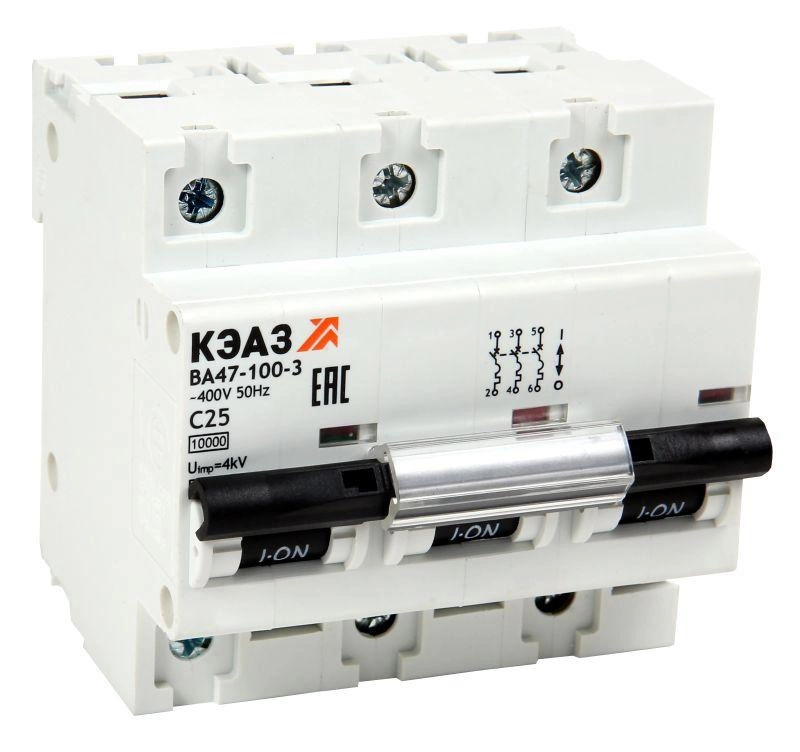Модульный автоматический 3 полюсный выключатель переменного тока с предельной коммутационной способностью при переменном токе 10 кА на номинальный ток 80 А .