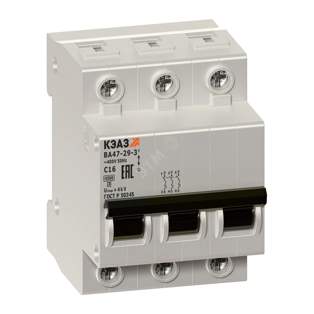 Модульный автоматический 3 полюсный выключатель переменного тока с предельной коммутационной способностью при переменном токе 4.5 кА на номинальный ток 4 А .