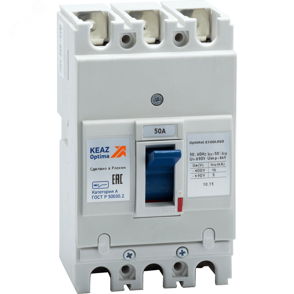 Силовой 3 полюсный автоматический выключатель переменного тока в литом корпусе на номинальный ток 50 А. Новая разработка КЭАЗ - серия автоматических выключателей OptiMat E - обеспечивает необходимую защиту кабелей и оборудования на токи до 250А и полностью отвечают современным стандартам (ГОСТ Р 50030.2, МЭК60947-2 и ТР ТС), требованиям Российского морского регистра судоходства. Предельная коммутационная способность (ПКС) автоматических выключателей от 10 кА при 400В переменного тока частотой 50/60 Гц является самым нужным значением для большинства объектов.