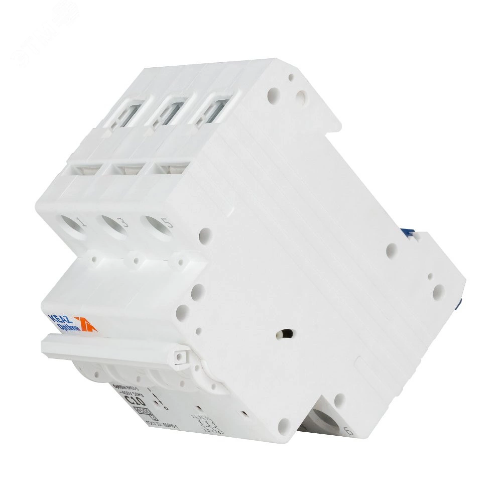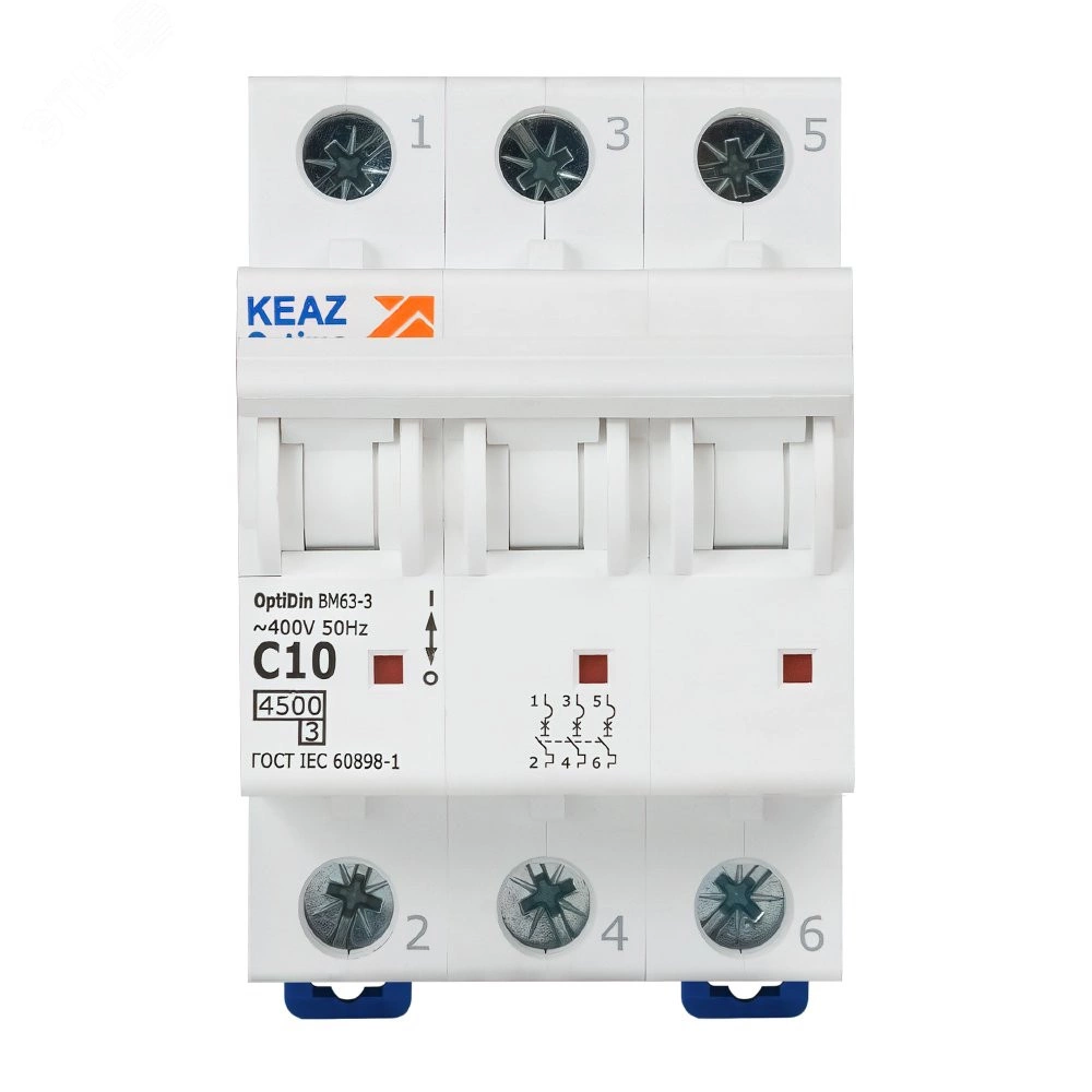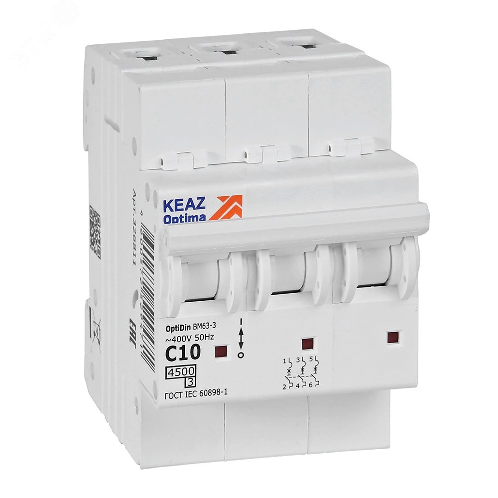 Модульный автоматический 3 полюсный выключатель переменного тока с предельной коммутационной способностью при переменном токе 4,5 кА на номинальный ток 10 А. Модульные автоматические выключатели OptiDin ВМ63 4,5 кА предназначены для применения в электрических цепях напряжением до 400 В переменного тока частоты 50 Гц, их защиты при перегрузках и коротких замыканиях, проведения тока в нормальном режиме и оперативных включений и отключений указанных цепей (до 30 раз в сутки). OptiDin ВМ63 4,5 кА разработаны специально для использования в жилищном секторе - распределительных, квартирных и этажных щитах.