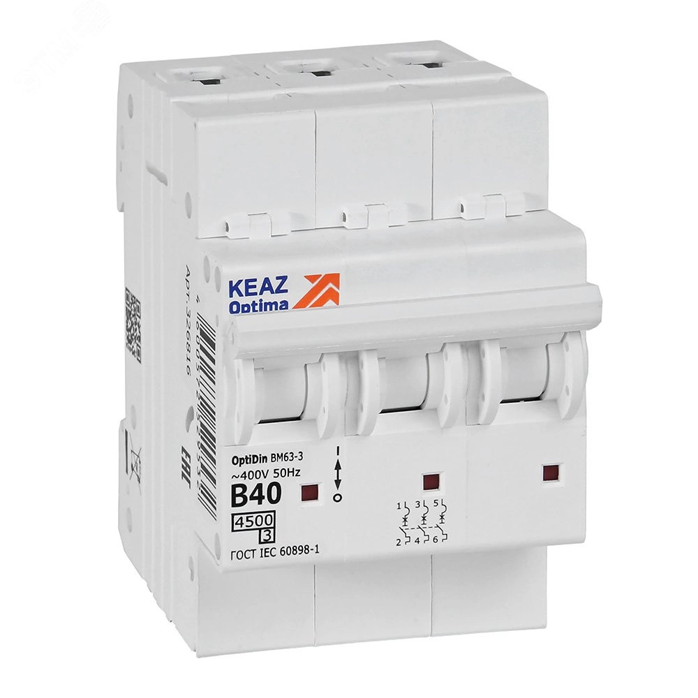 Модульный автоматический 3 полюсный выключатель переменного тока с предельной коммутационной способностью при переменном токе 4,5 кА на номинальный ток 40 А. Модульные автоматические выключатели OptiDin ВМ63 4,5 кА предназначены для применения в электрических цепях напряжением до 400 В переменного тока частоты 50 Гц, их защиты при перегрузках и коротких замыканиях, проведения тока в нормальном режиме и оперативных включений и отключений указанных цепей (до 30 раз в сутки). OptiDin ВМ63 4,5 кА разработаны специально для использования в жилищном секторе - распределительных, квартирных и этажных щитах.