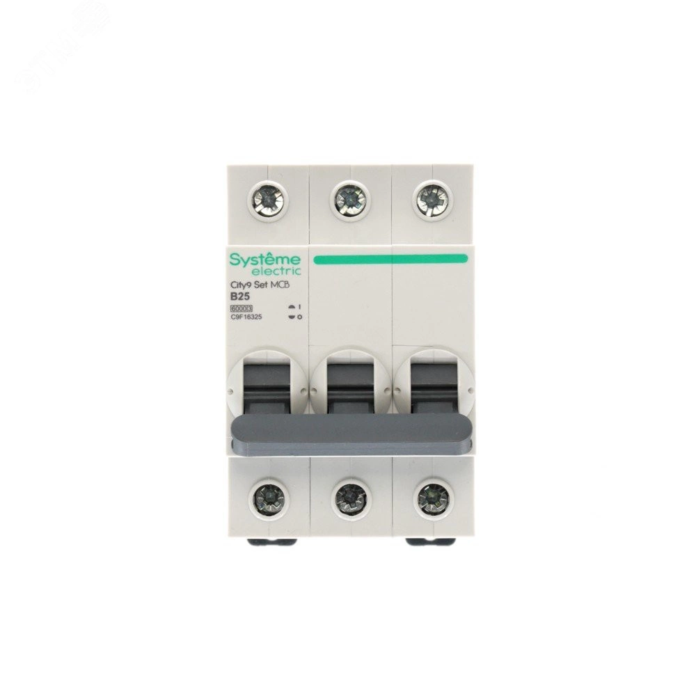 Автоматический выключатель серии City9 Set Systeme Electric, 3-полюсный, номинальный ток 25 А, характеристика B, Icn - 6 кА. Применяется в электрических сетях напряжением 400 В. Предназначен для защиты от перегрузок и токов короткого замыкания. Оснащен механизмом «мгновенной коммутации». Ударопрочный корпус из специального пластика с 6 металлическими заклепками. Безопасные клеммы исключают попадание кабелей в заклеммное пространство.
