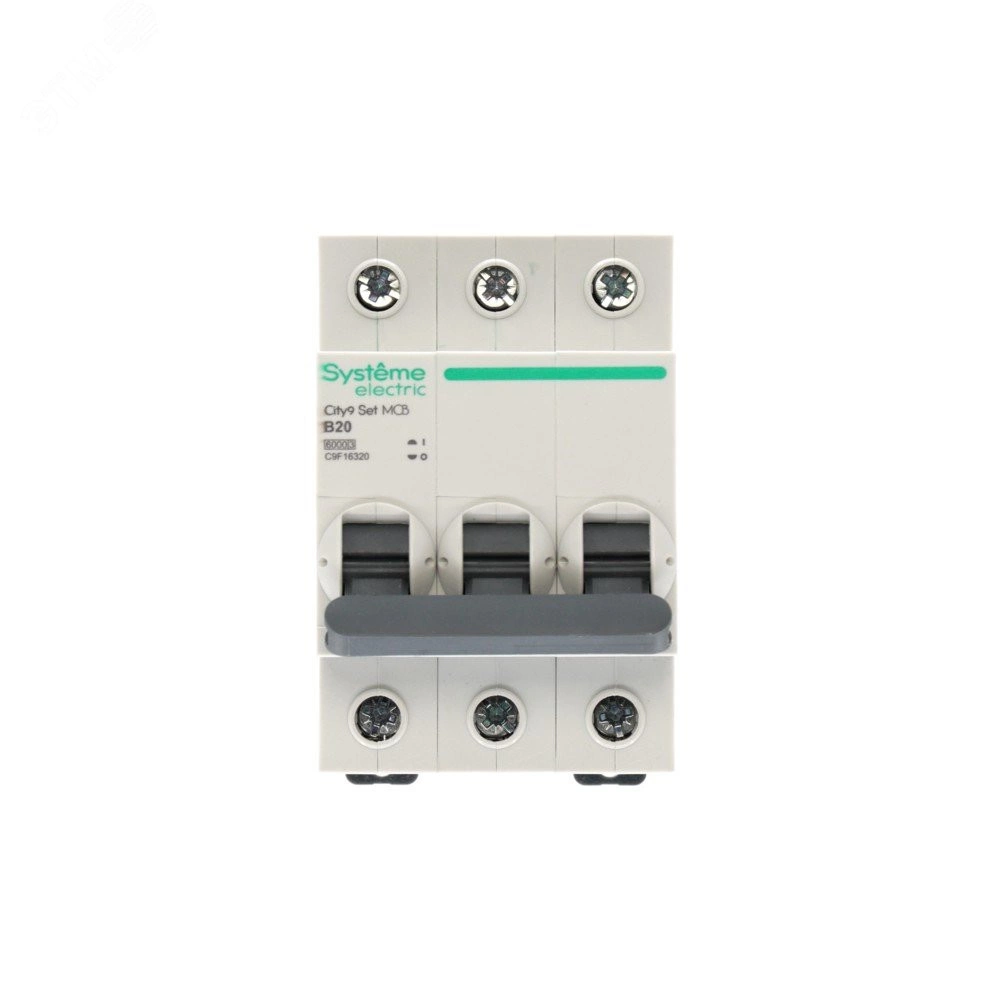 Автоматический выключатель серии City9 Set Systeme Electric, 3-полюсный, номинальный ток 20 А, характеристика B, Icn - 6 кА. Применяется в электрических сетях напряжением 400 В. Предназначен для защиты от перегрузок и токов короткого замыкания. Оснащен механизмом «мгновенной коммутации». Ударопрочный корпус из специального пластика с 6 металлическими заклепками. Безопасные клеммы исключают попадание кабелей в заклеммное пространство.