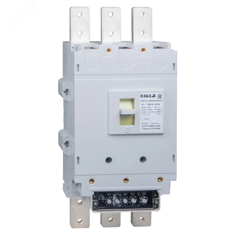 Силовой 3 полюсный автоматический выключатель переменного тока в литом корпусе на номинальный ток 630 А. Выключатели КЭАЗ предназначены для применения в электрических цепях переменного тока частоты 50, 60 Гц напряжением 690 В, для нечастых оперативных включений и отключений (до 6 в час), указанных цепей и защиты электрооборудования от перегрузок и коротких замыкании, а также нечастых прямых пусков асинхронных двигателей. Выключатели изготавливаются с полупроводниковым максимальным расцепителем тока на базе микроконтроллера Almega 16L.
