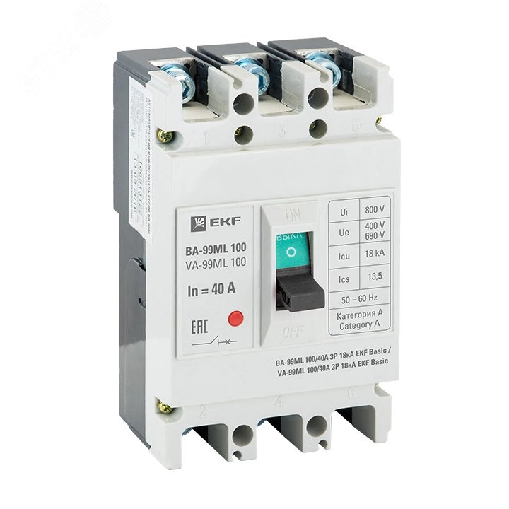 Выключатель ВА-99 выполнен в виде моноблока и состоит из основания и крышки с фальшпанелью, в которой имеется окно для рукоятки управления и толкатель кнопки 'Тест' - проверки механизма отключения выключателя. Основание выполнено из термостойкой пластмассы, не поддерживающей горение и являющейся несущей конструкцией для присоединительных зажимов, неподвижных и подвижных контактов с системой дугогашения, механизма управления, блока защиты от сверхтоков. Крышка закрывает все подвижные элементы механизма управления и внутренние токоведущие части.