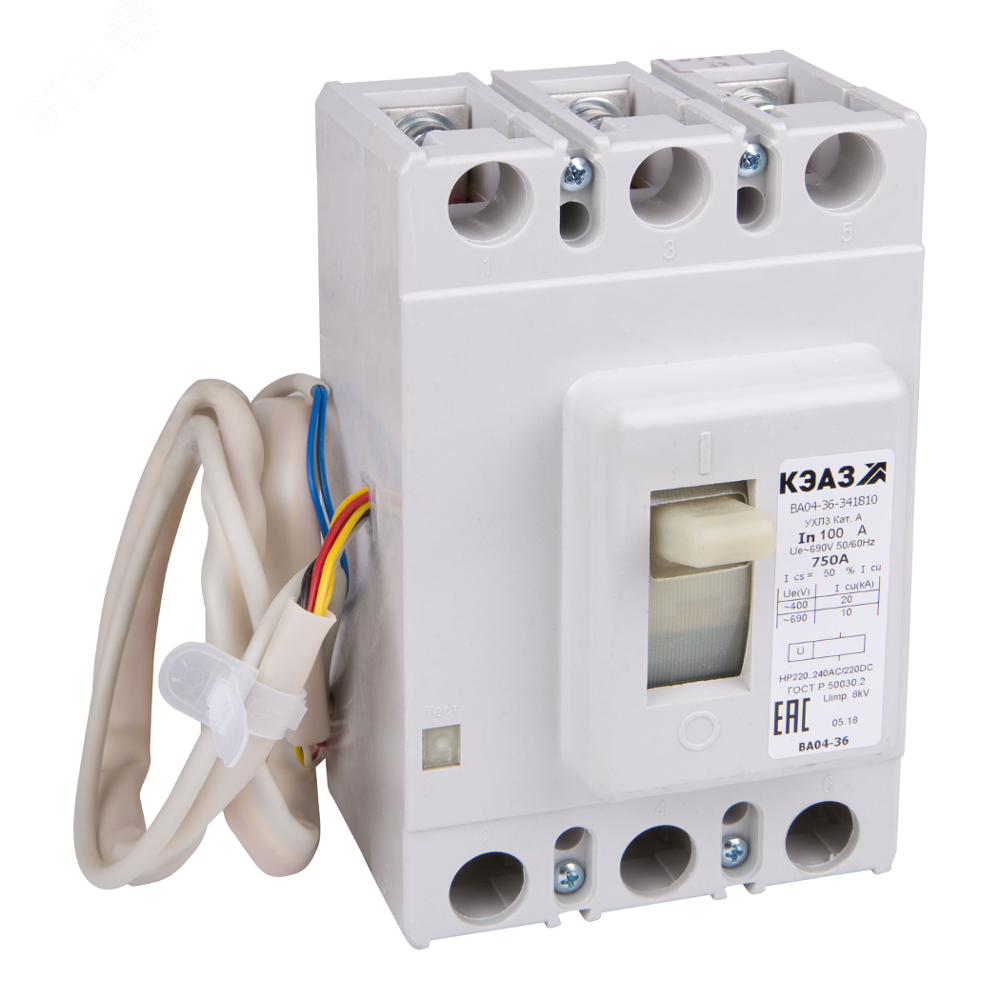 Силовой 3 полюсный автоматический выключатель переменного тока в литом корпусе на номинальный ток 63 А. Трехполюсные автоматические выключатели ВА04-36 с ПКС до 20 кА предназначены для применения в электрических цепях с напряжением 440 В постоянного / 690 В переменного тока частотой 50 и 60 Гц, их защиты от токов короткого замыкания, токов перегрузки, а также для нечастых оперативных включений и отключений.