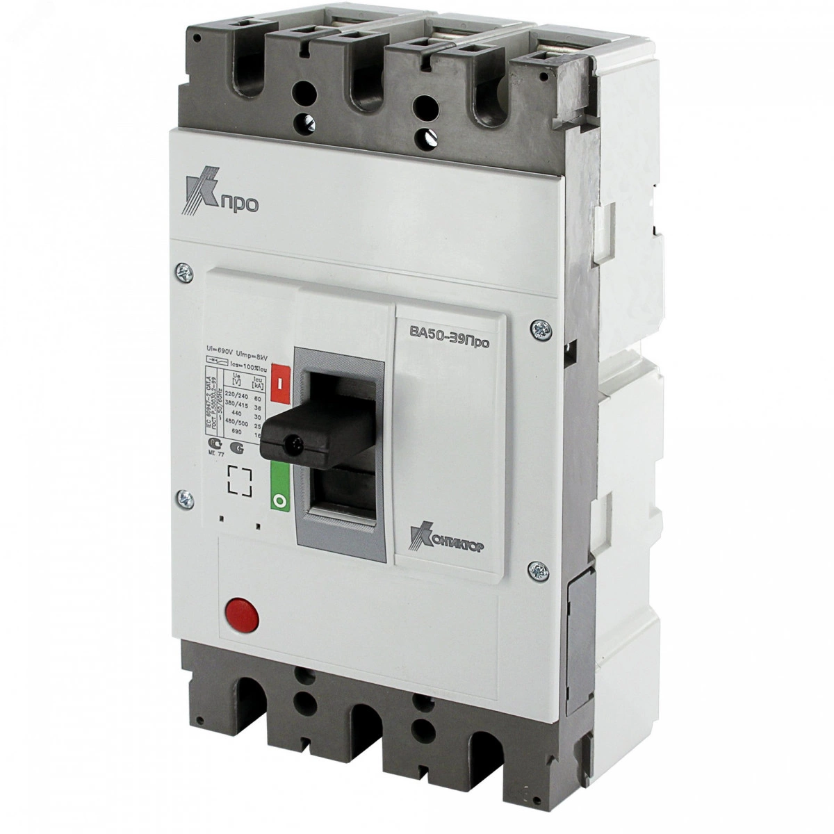Автоматический выключатель серии ВА50-39Про на токи от 250 до 630 А предназначен для проведения тока в нормальном режиме и отключения тока при коротких замыканиях, перегрузках, недопустимых снижениях напряжения, а также для нечастых оперативных включений и отключений электрических цепей. Рассчитан на эксплуатацию в электроустановках с номинальным напряжением до 690 В переменного тока частоты 50/60 Гц. Отличается высокой безопасностью, традиционным качеством и современными конструкторскими решениями в сочетании с компактностью. Имеются исполнения с электронным и термомагнитными расцепителями. Уставки термомагнитных расцепителей также являются регулируемыми. Отличительные особенности автоматических выключателей - адаптация к современным условиям, улучшенная эргономика, унифицированные аксессуары.