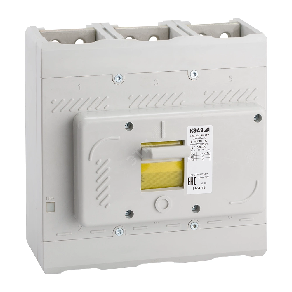 Силовой 3 полюсный автоматический выключатель переменного тока в литом корпусе на номинальный ток 320 А. Трехполюсные автоматические выключатели КЭАЗ типа ВА 51-39 предназначены для применения в электрических цепях с напряжением 400 / 690 В переменного тока частотой 50 и 60 Гц и 440В постоянного тока, их защиты от токов короткого замыкания, токов перегрузки, недопустимых снижений напряжения, а также для нечастых оперативных включений и отключений.