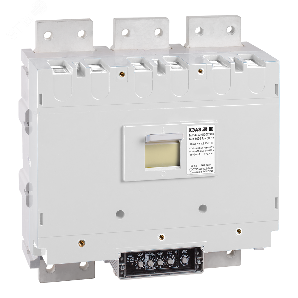 Силовой 3 полюсный автоматический выключатель переменного тока в литом корпусе на номинальный ток 2000 А. Выключатели КЭАЗ предназначены для применения в электрических цепях переменного тока частоты 50, 60 Гц напряжением 690 В, для нечастых оперативных включений и отключений (до 6 в час), указанных цепей и защиты электрооборудования от перегрузок и коротких замыкании, а также нечастых прямых пусков асинхронных двигателей. Выключатели изготавливаются с полупроводниковым максимальным расцепителем тока на базе микроконтроллера Atmega 16L.