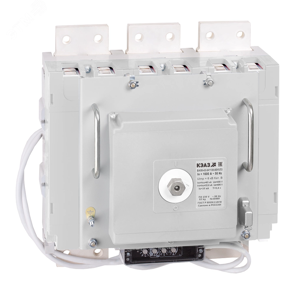 Силовой 3 полюсный автоматический выключатель переменного тока в литом корпусе на номинальный ток 1600 А. Выключатели КЭАЗ предназначены для применения в электрических цепях переменного тока частоты 50, 60 Гц напряжением 690 В, для нечастых оперативных включений и отключений (до 6 в час), указанных цепей и защиты электрооборудования от перегрузок и коротких замыкании, а также нечастых прямых пусков асинхронных двигателей. Выключатели изготавливаются с полупроводниковым максимальным расцепителем тока на базе микроконтроллера Atmega 16L.