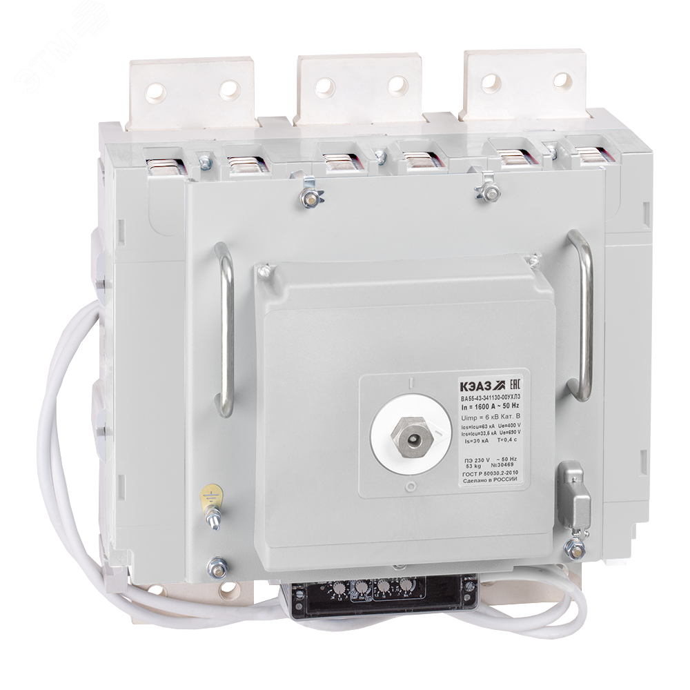 Силовой 3 полюсный автоматический выключатель переменного тока в литом корпусе на номинальный ток 2000 А. Выключатели КЭАЗ предназначены для применения в электрических цепях переменного тока частоты 50, 60 Гц напряжением 690 В, для нечастых оперативных включений и отключений (до 6 в час), указанных цепей и защиты электрооборудования от перегрузок и коротких замыкании, а также нечастых прямых пусков асинхронных двигателей. Выключатели изготавливаются с полупроводниковым максимальным расцепителем тока на базе микроконтроллера Atmega 16L.