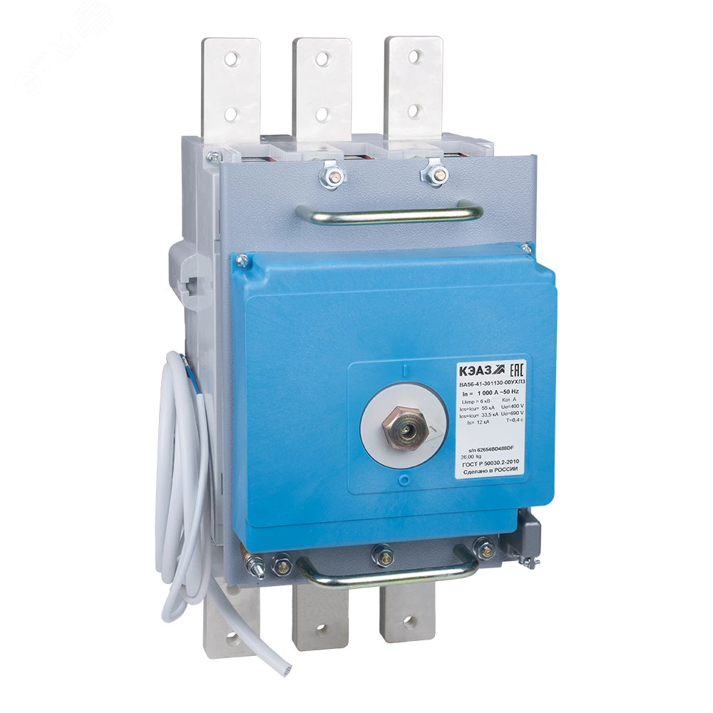 Силовой 3 полюсный автоматический выключатель переменного тока в литом корпусе на номинальный ток 1000 А. Выключатели КЭАЗ предназначены для применения в электрических цепях переменного тока частоты 50, 60 Гц напряжением 690 В, для нечастых оперативных включений и отключений (до 6 в час), указанных цепей и защиты электрооборудования от перегрузок и коротких замыкании, а также нечастых прямых пусков асинхронных двигателей. Выключатели изготавливаются с полупроводниковым максимальным расцепителем тока на базе микроконтроллера Almega 16L.
