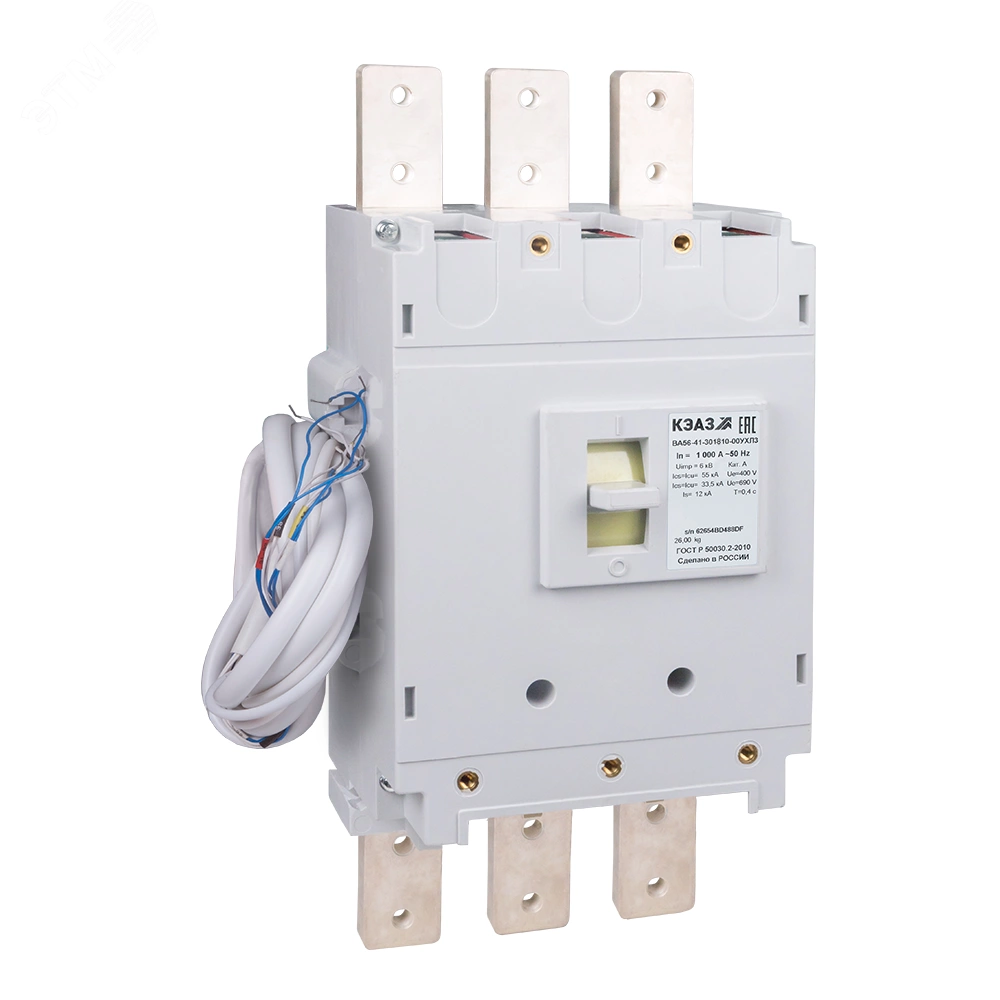 Силовой 2 полюсный автоматический выключатель постоянного тока в литом корпусе на номинальный ток 1000 А. Выключатели КЭАЗ предназначены для применения в электрических цепях переменного тока частоты 50, 60 Гц напряжением 690 В, для нечастых оперативных включений и отключений (до 6 в час), указанных цепей и защиты электрооборудования от перегрузок и коротких замыкании, а также нечастых прямых пусков асинхронных двигателей. Выключатели изготавливаются с полупроводниковым максимальным расцепителем тока на базе микроконтроллера Almega 16L.