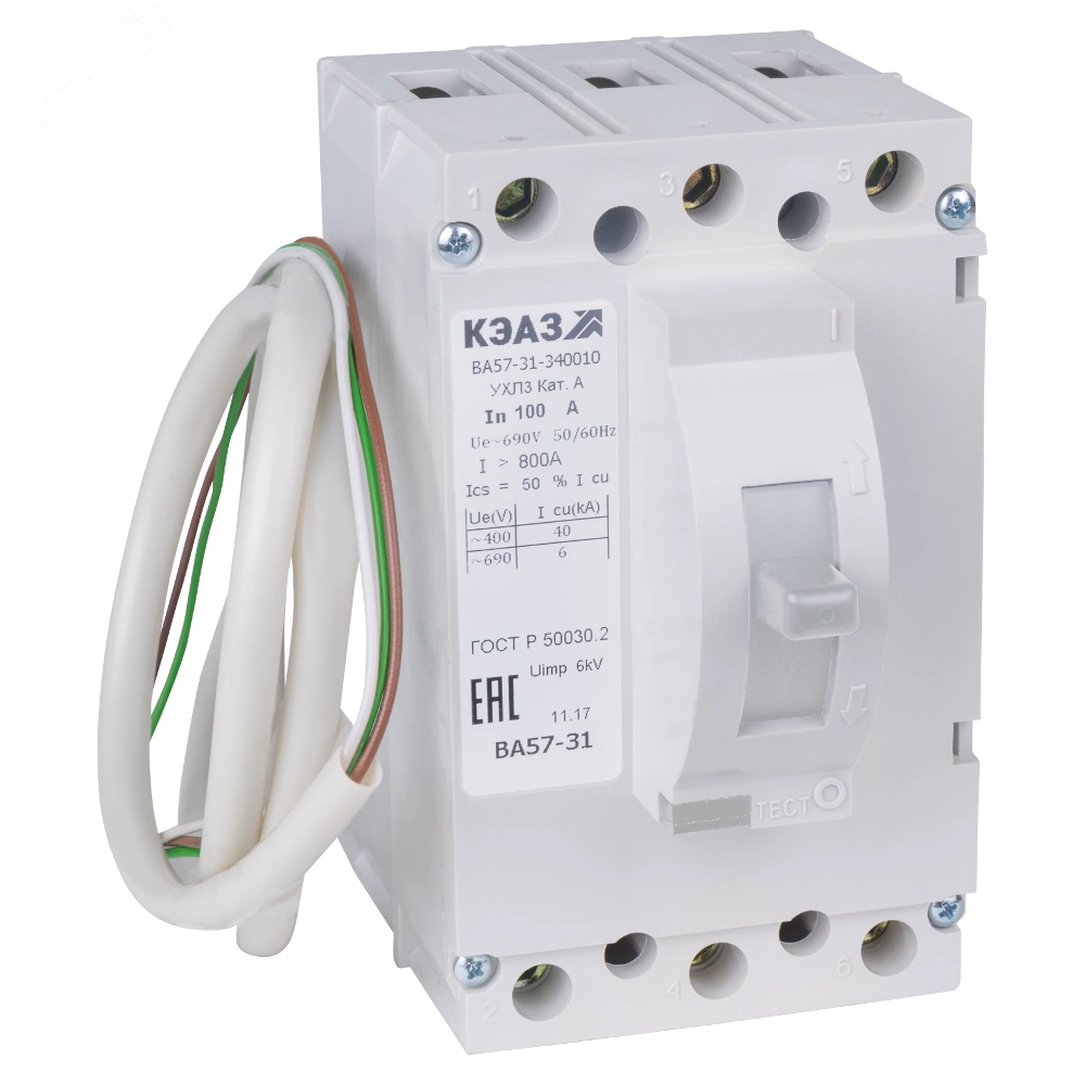Силовой 3 полюсный автоматический выключатель переменного тока в литом корпусе на номинальный ток 100 А. Трехполюсные автоматические выключатели КЭАЗ типа ВА 57-31 предназначены для применения в электрических цепях с напряжением до 220 постоянного / 690 В переменного тока частотой 50 и 60 Гц, их защиты от токов короткого замыкания, токов перегрузки, проведения тока в нормальном режиме и нечастых оперативных включений и отключений.