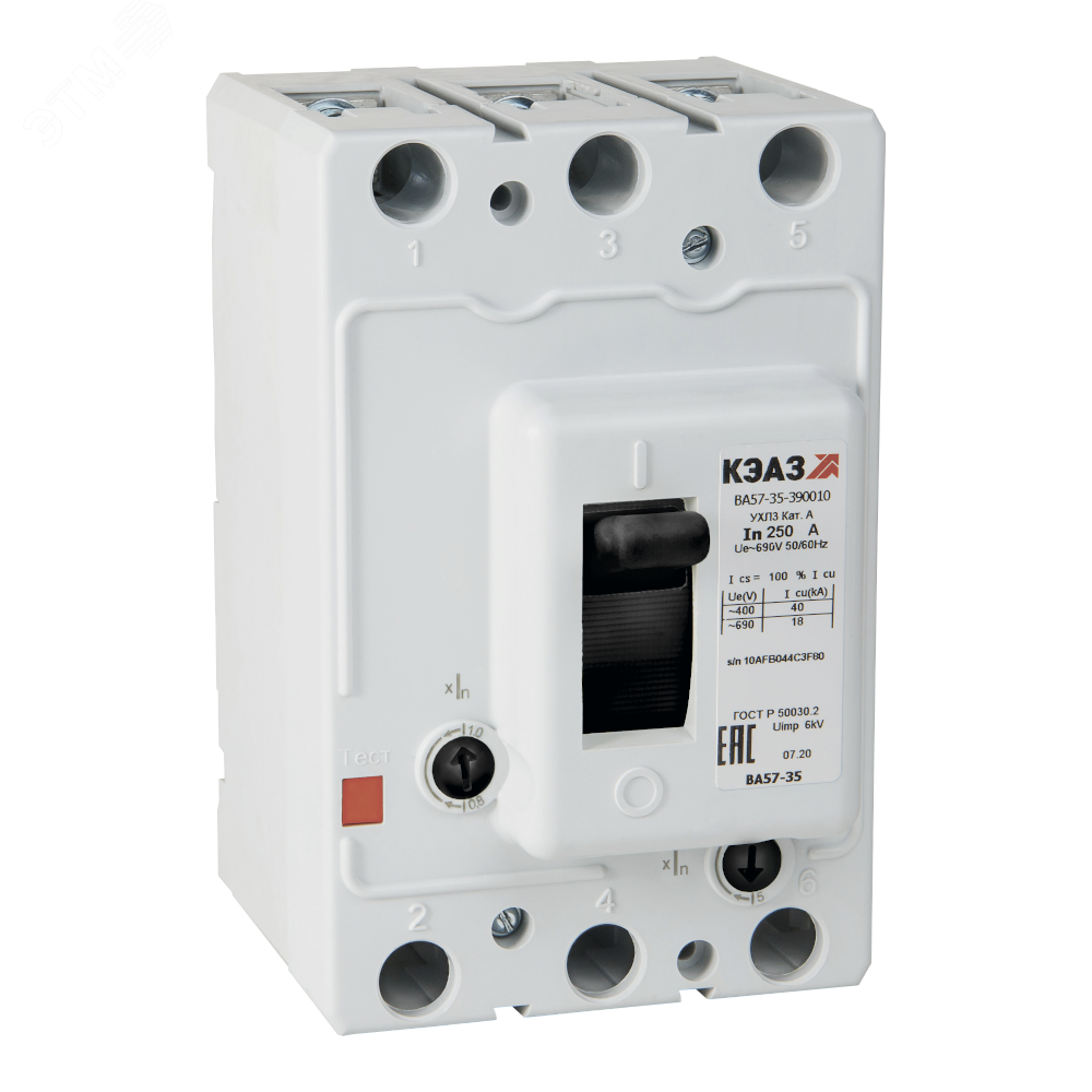 Силовой 3 полюсный автоматический выключатель переменного тока в литом корпусе на номинальный ток 250 А. Трехполюсные автоматические выключатели КЭАЗ серии ВА57-35 предназначены для применения в электрических цепях с напряжением 400 / 690 В переменного тока частотой 50 и 60 Гц и 110 / 220 / 440 В постоянного тока, их защиты от токов короткого замыкания, токов перегрузки, недопустимых снижений напряжения, а также для нечастых оперативных включений и отключений.