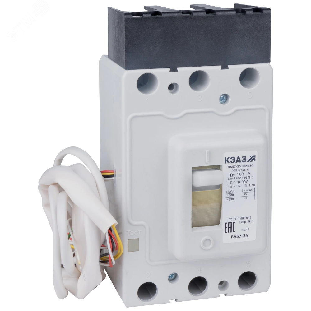 Силовой 3 полюсный автоматический выключатель постоянного тока в литом корпусе на номинальный ток 200 А. Трехполюсные автоматические выключатели КЭАЗ серии ВА57-35 предназначены для применения в электрических цепях с напряжением 400 / 690 В переменного тока частотой 50 и 60 Гц и 110 / 220 / 440 В постоянного тока, их защиты от токов короткого замыкания, токов перегрузки, недопустимых снижений напряжения, а также для нечастых оперативных включений и отключений.