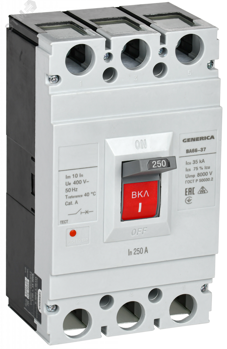 Автоматические выключатели ВА66 GENERICA предназначены для проведения тока в нормальном режиме и отключения тока при коротких замыканиях, перегрузке, а также для оперативных включений и отключений участков электрических цепей. Рассчитаны на эксплуатацию в электроустановках с номинальным рабочим напряжением до 400В и на номинальные токи от 16 до 630А.