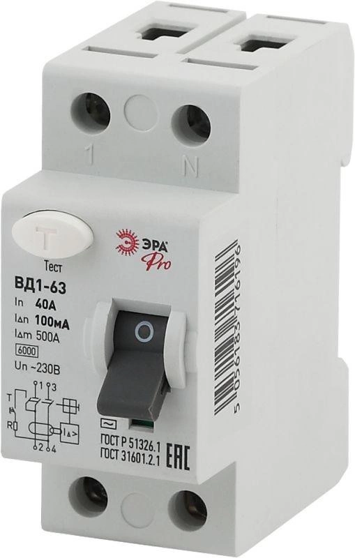 Выключатель дифференциального тока (УЗО) 1P+N 40А 100мА ВД1-63 Pro NO-902-38 ЭРА Б0031883