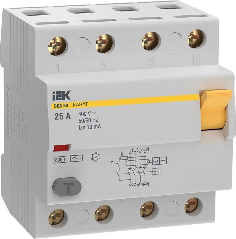 Полное описание: Выключатель дифференциального тока (УЗО) 4п 25А 10мА 6кА тип AC ВД3-63 KARAT IEK MDV20-4-025-010
