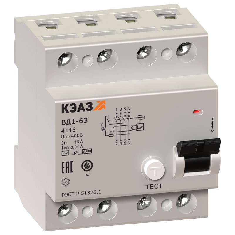 Четырехполюсное устройство защитного отключения на номинальный ток 25 А, номинальный отключающий дифференциальный ток 30 мА и рабочее напряжение переменного тока 400 В.