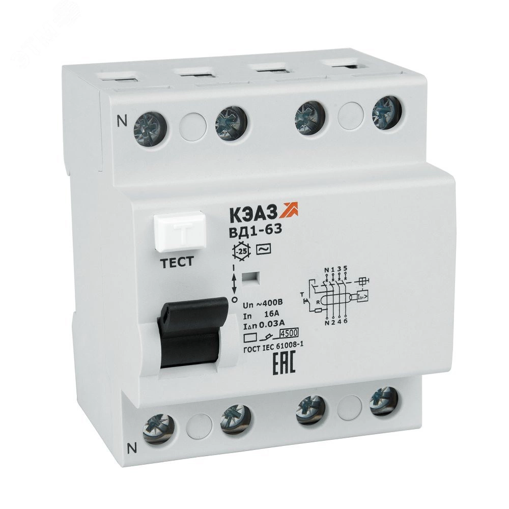 Выключатель дифференциального тока (УЗО) без защиты от сверхтоков 4П 25А 300мА ВД1-63-4425-АС-УХЛ4-КЭАЗ