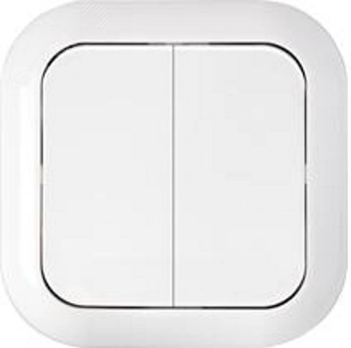Выключатель двухклавишный скрытой установки. В качестве материала для производства изделия использовался пластик ABS. Выключатель имеет посеребренные контакты. У выключателя глянцевая поверхность. Он устойчив к УФ-излучению и имеет ударо-прочный и стойкий к излому корпус.