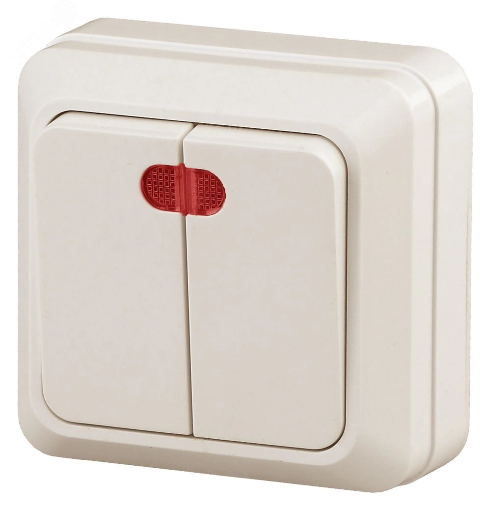 Выключатель двухклавишный с подсветкой для открытой установки из серии Intro Quadro. Устройства Quadro Эконом поставляются без монтажных пластин. Монтаж механизма производится сразу на поверхность стены.